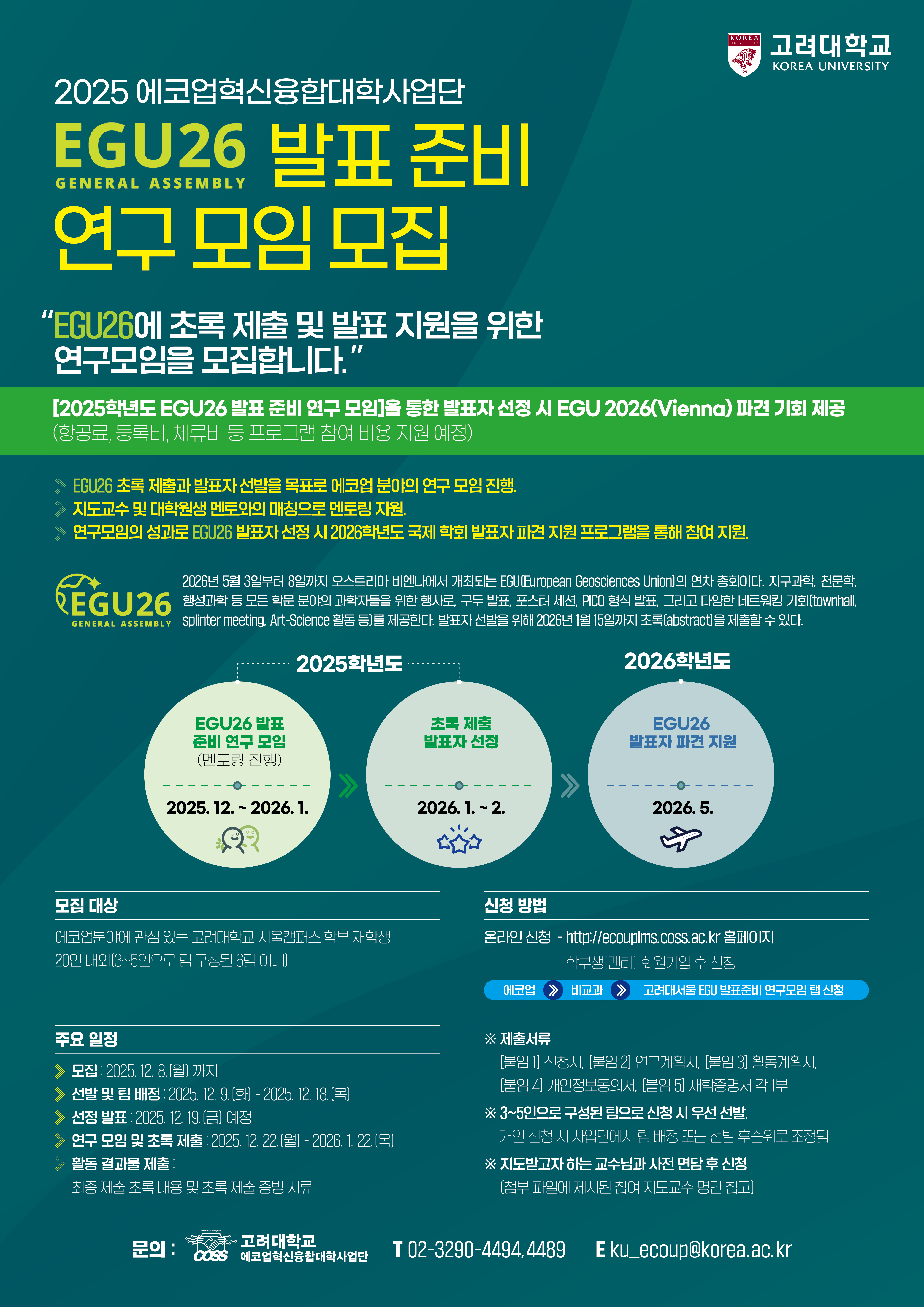 2025학년도 'EGU 2026' 발표 준비모임 지원 프로그램 신청 안내(~12/8)