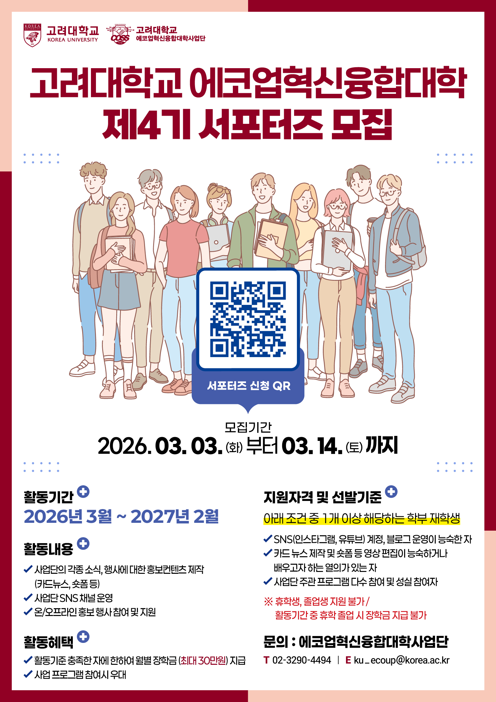 에코업혁신융합대학사업단에서 2026학년도 에코업혁신융합대학사업단 제4기 서포터즈를 모집하오니